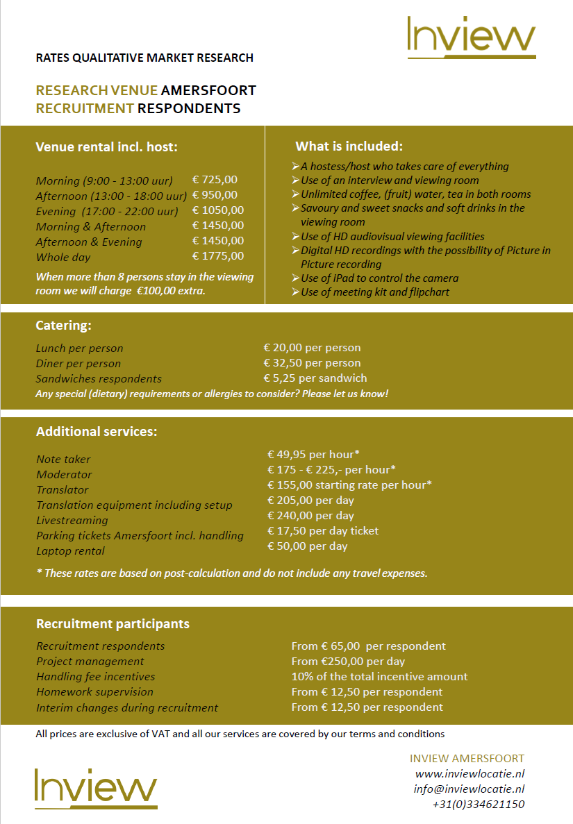 Market research is at its best when conducted in a room specially made for it. A central location that has easy access to highways and public transport. A location with many possibilities and rooms for all different kinds of research. And finally, a location where all recording equipment is installed. Inview offers it all in our venue in Amersfoort.